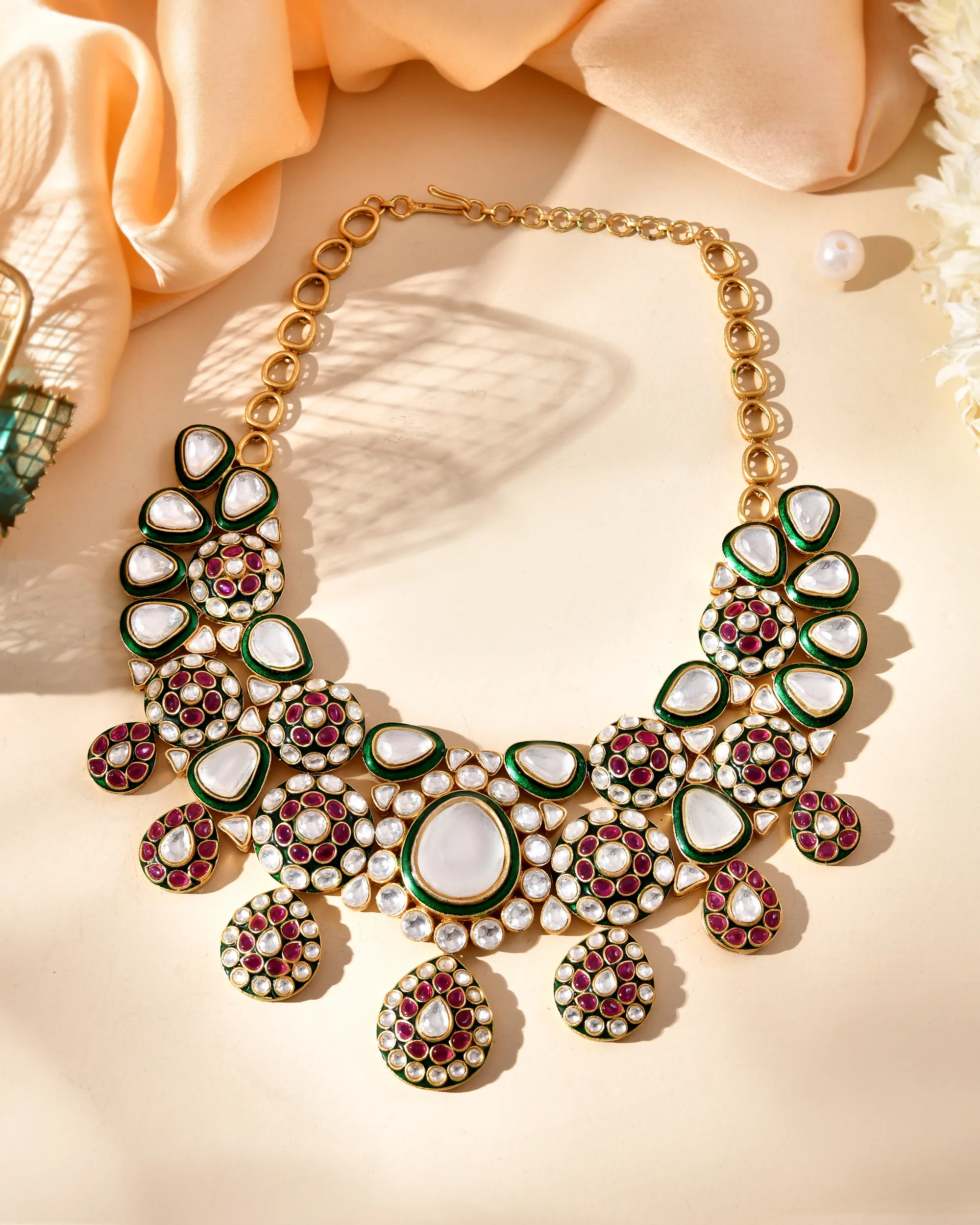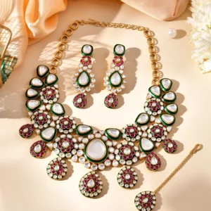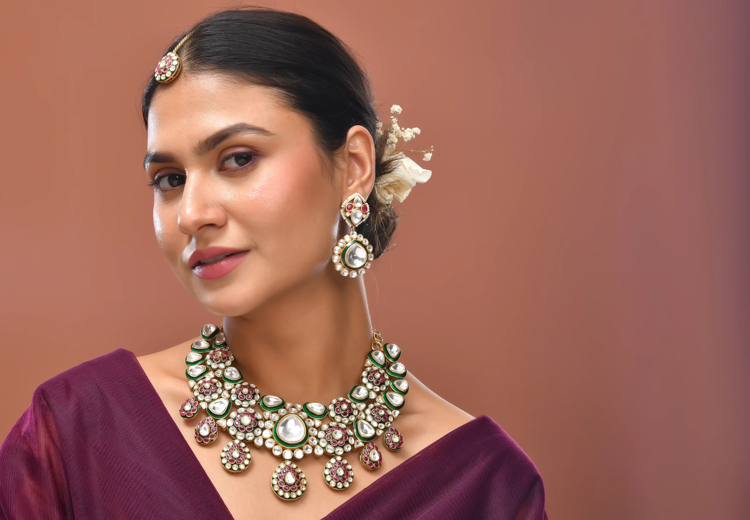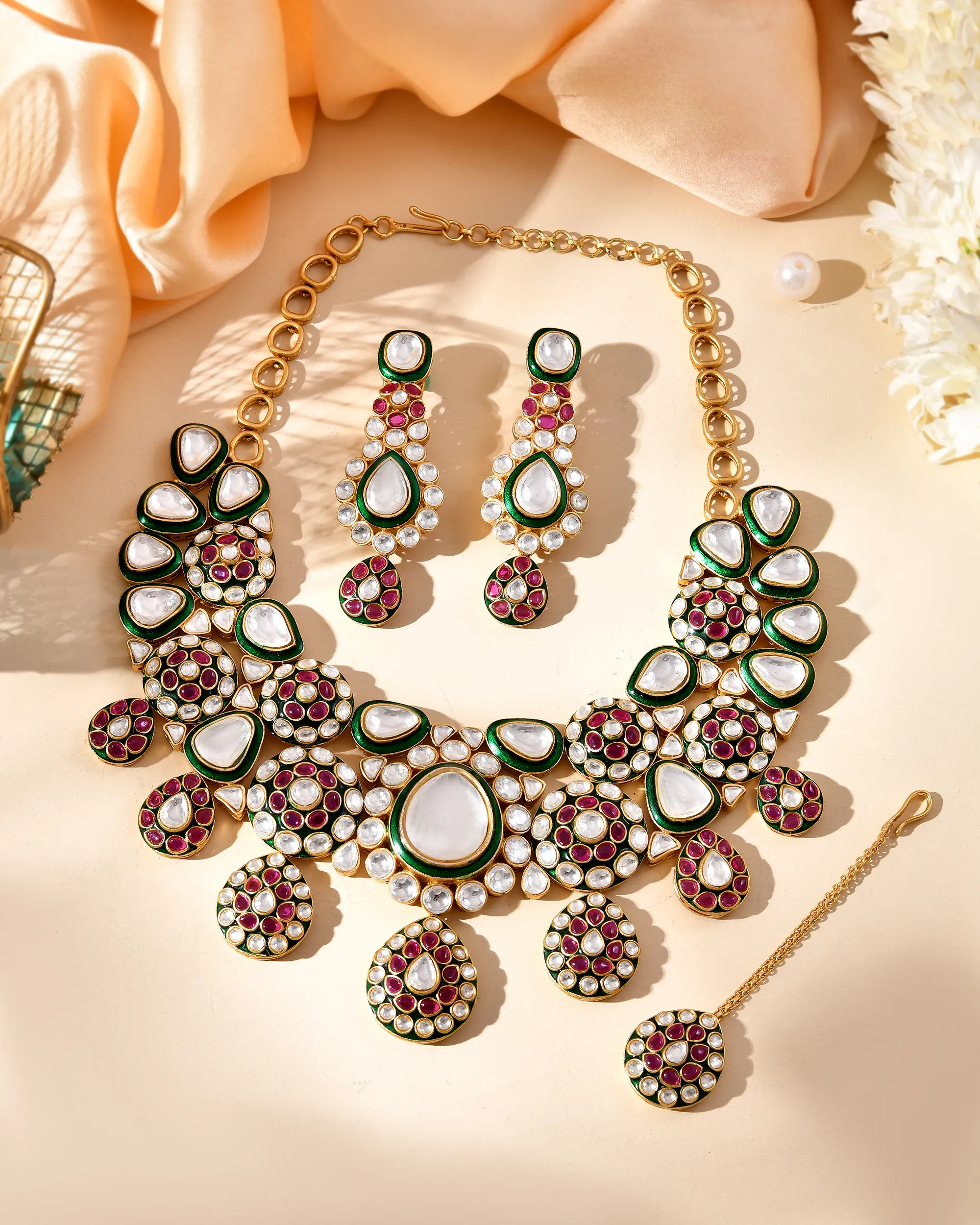 Stunning traditional indian kundan necklace set, likely gold-plated. Appear to be a chocker -style necklace. Perfect for tradieiona function
