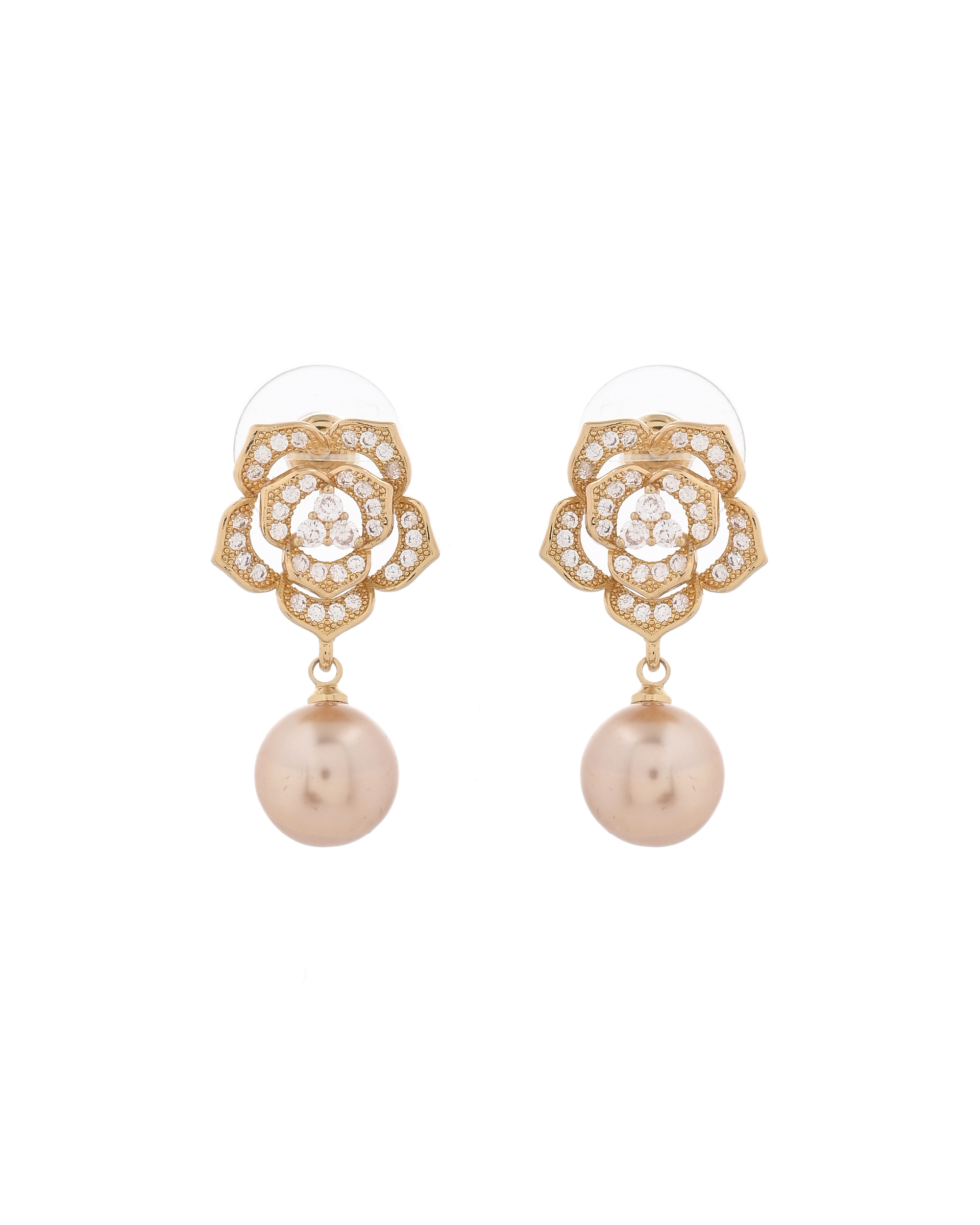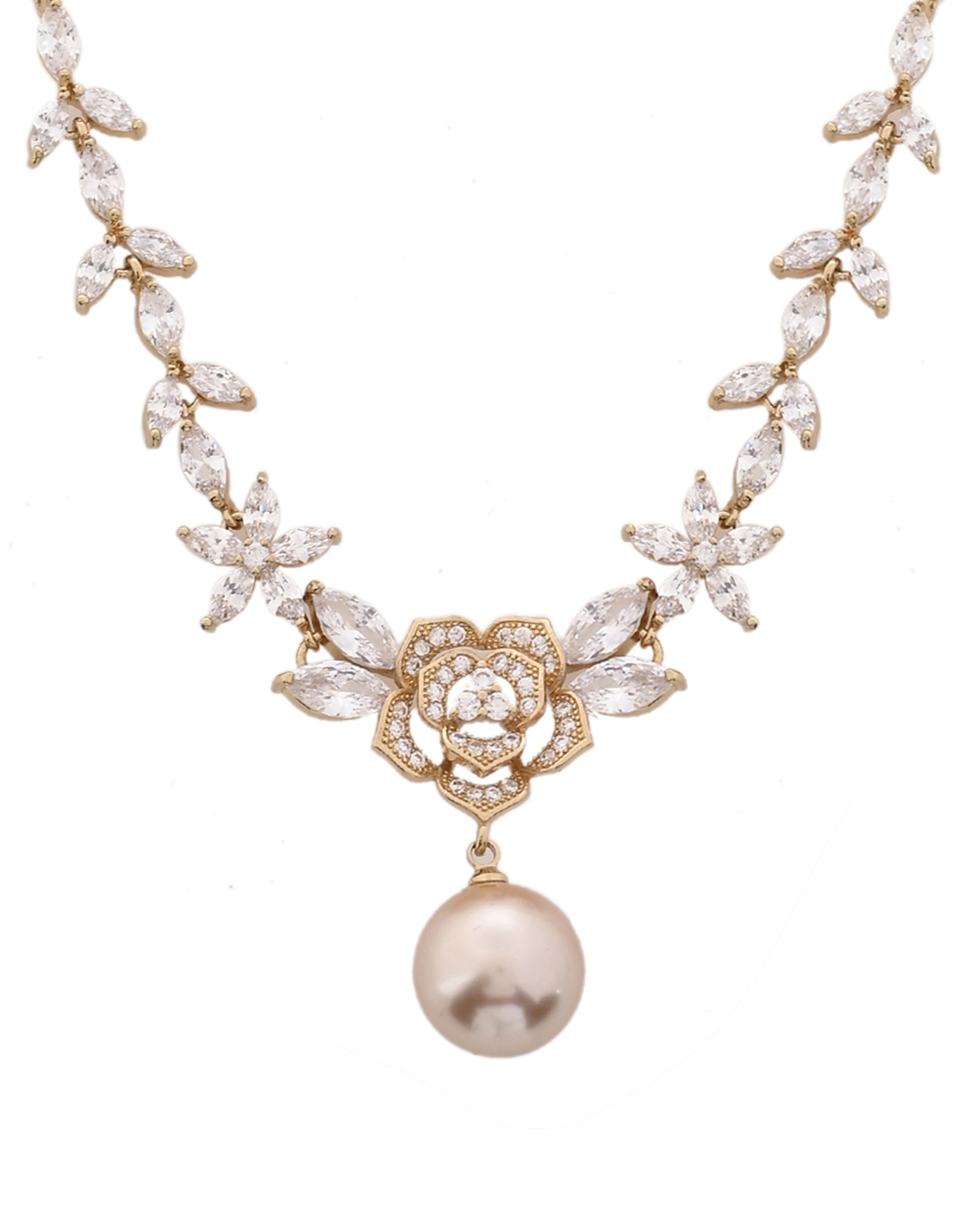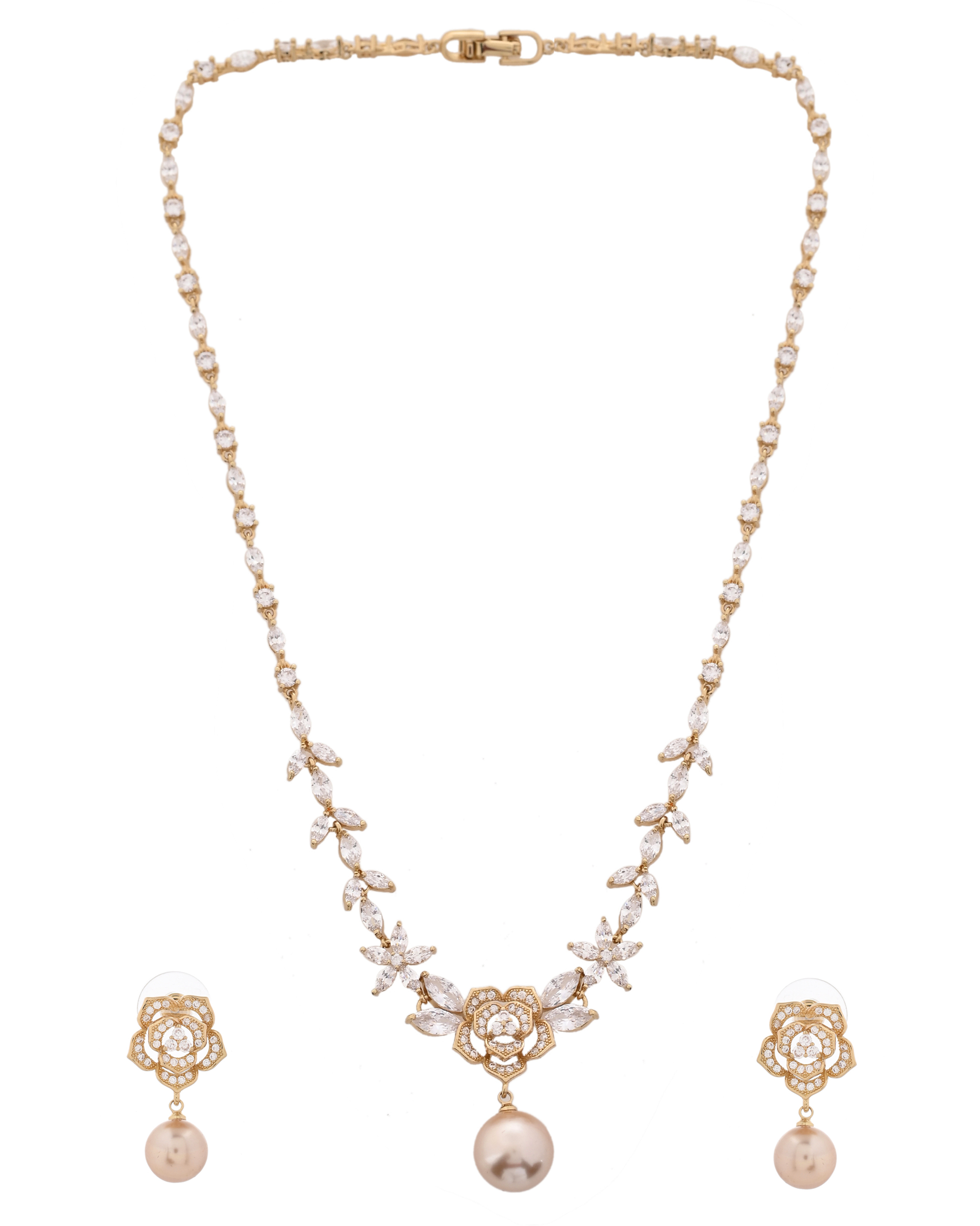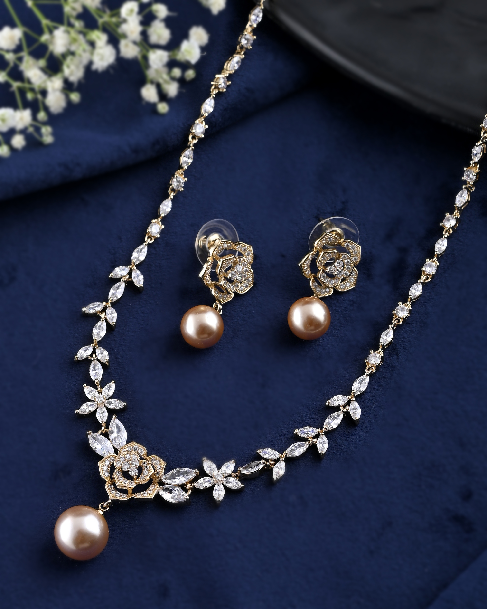 This graceful necklace set brings together the charm of floral design and the elegance of rose gold. Adorned with shimmering white stones and intricate flower motifs, the set features a beautiful champagne pearl drop at the center and on matching earrings. Ideal for weddings, festive celebrations, or romantic evenings, this piece adds a soft, feminine glow to your ensemble.