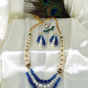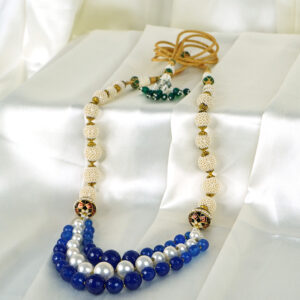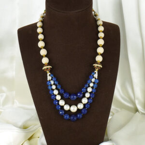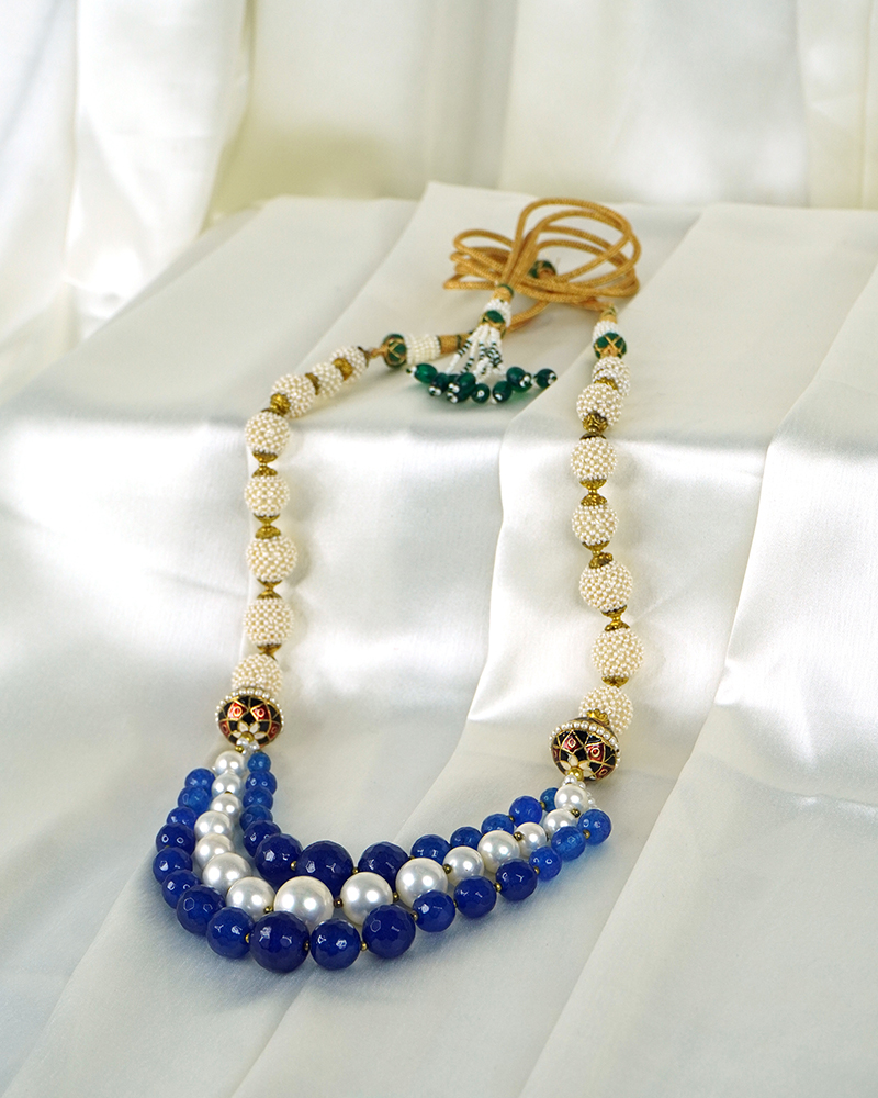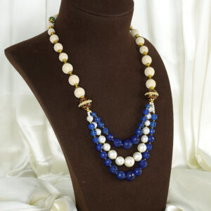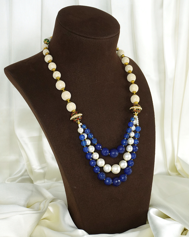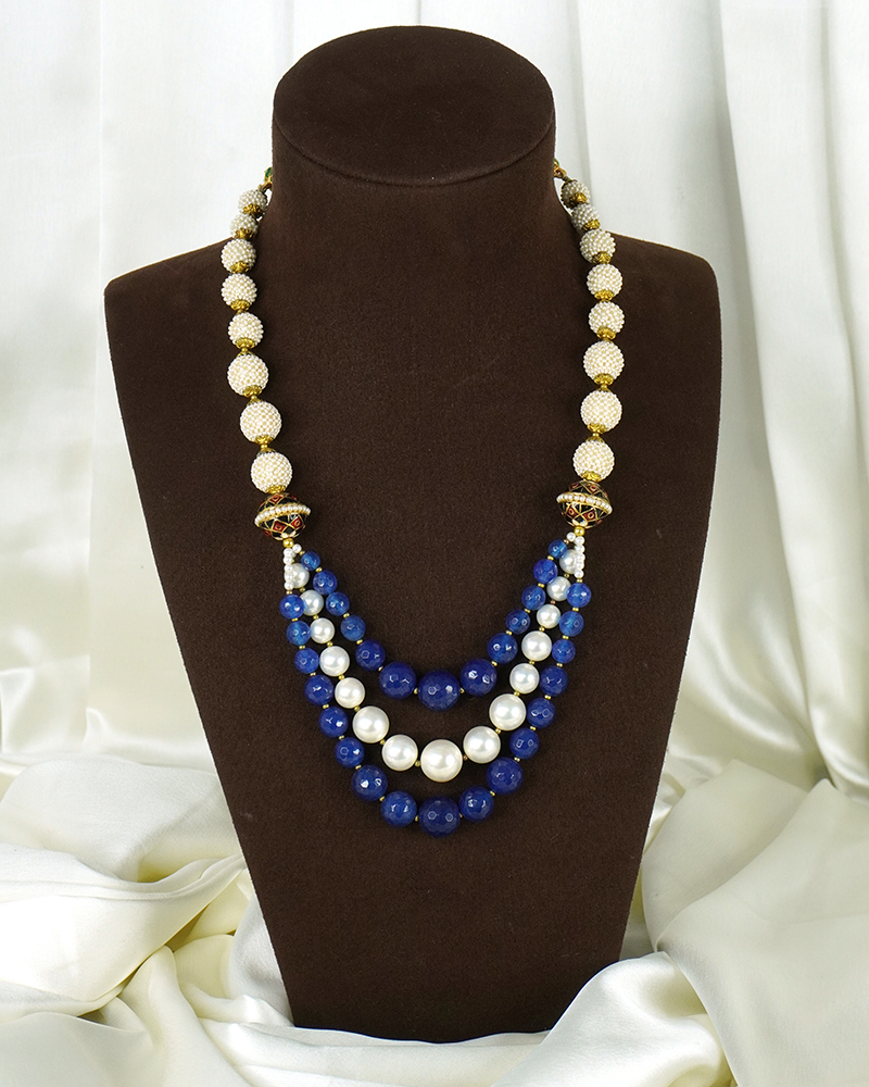 This statement necklace features a regal blend of rich royal blue faceted beads and luminous white pearls, arranged in graceful layers. The strand transitions into ornate hand-beaded pearl balls and traditional enamelled accents near the clasps, adding a luxurious and vintage-inspired touch.