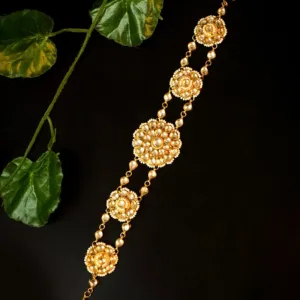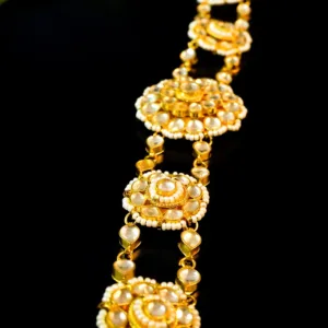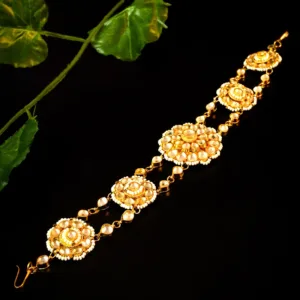 Channel timeless tradition with this elaborate multi-circle matha patti, showcasing a cascading design of five intricately adorned floral discs. Embellished with shimmering kundan work, delicate pearls, and golden detailing, this maang tikka evokes a regal charm that’s perfect for bridal ensembles or festive occasions. The symmetrical floral patterns add a graceful rhythm to the design, making it a captivating centerpiece for your ethnic look. Ideal for those who adore classic elegance with a bold touch.