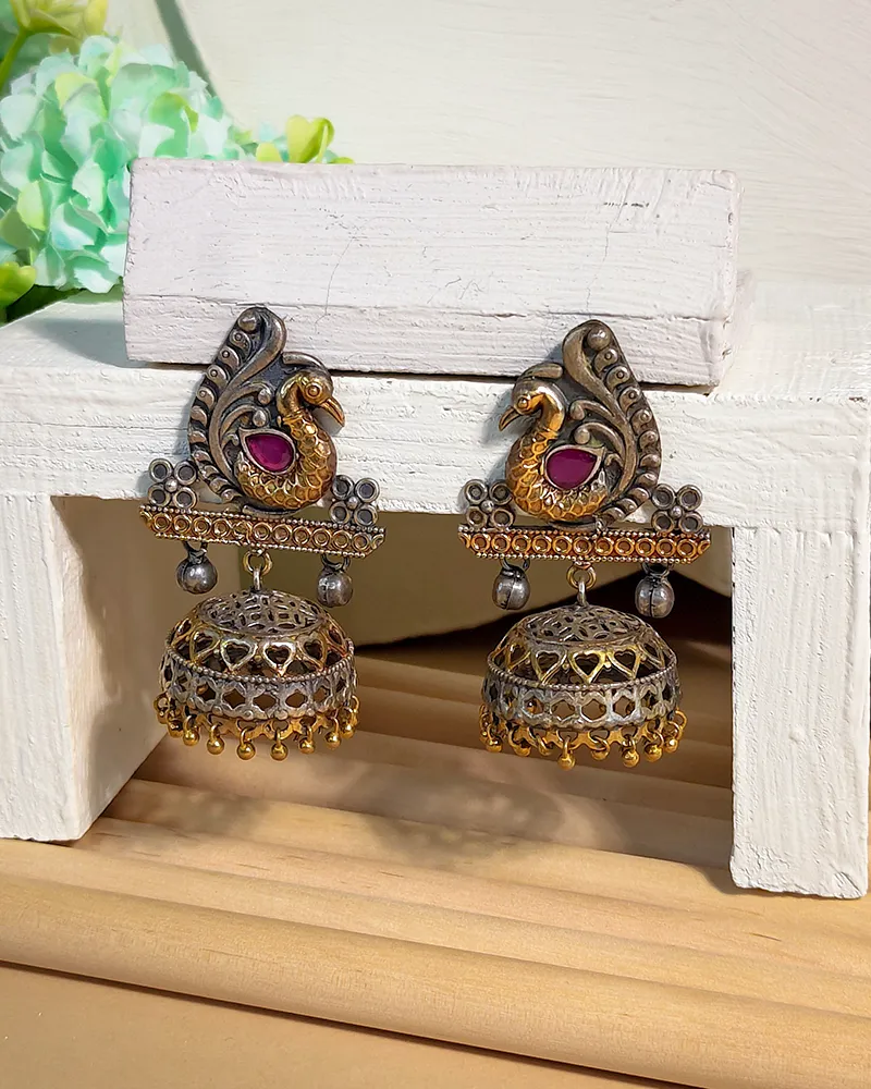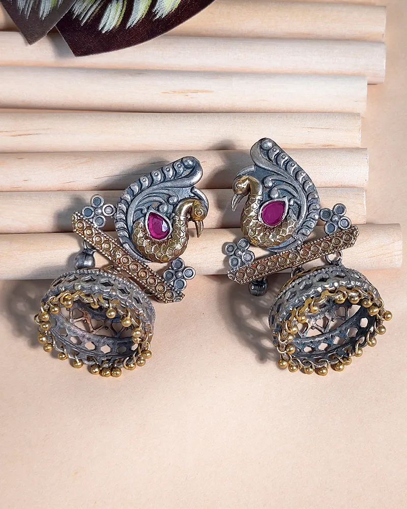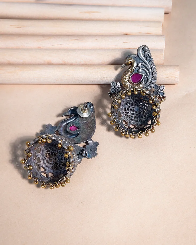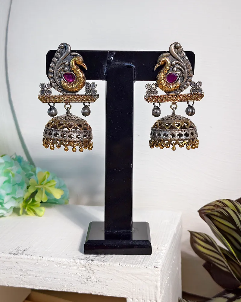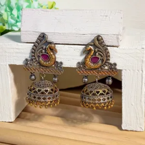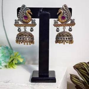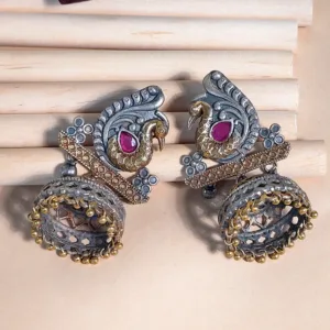 Traditional oxidised work earrings featuring a detailed peacock designperfect for adding a traditional touch.