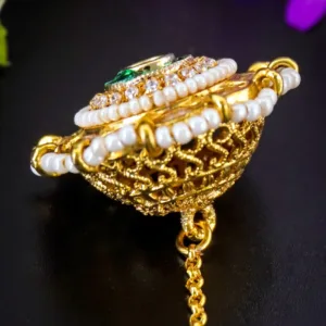 | Material | Gold-tone alloy, faux pearls, Ruby-red central stone (synthetic) |