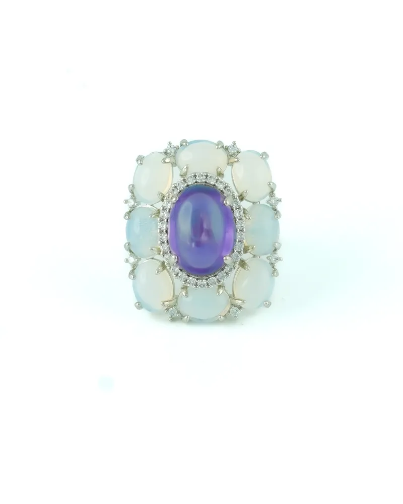 A beautiful ring with a bold center stone, beautifully surrounded by elegant gems and fine detailing, perfect for traditional and festive occasions.
