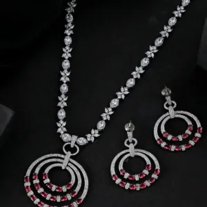 Make a bold and glamorous statement with this intricately crafted silver-tone necklace set. The piece features a sparkling diamond-studded chain paired with a striking triple-circle pendant adorned with radiant ruby-red stones. Complemented by matching earrings that mirror the pendant?s design, this set brings a perfect balance of elegance and modern flair, ideal for weddings, festive occasions, and grand celebrations.