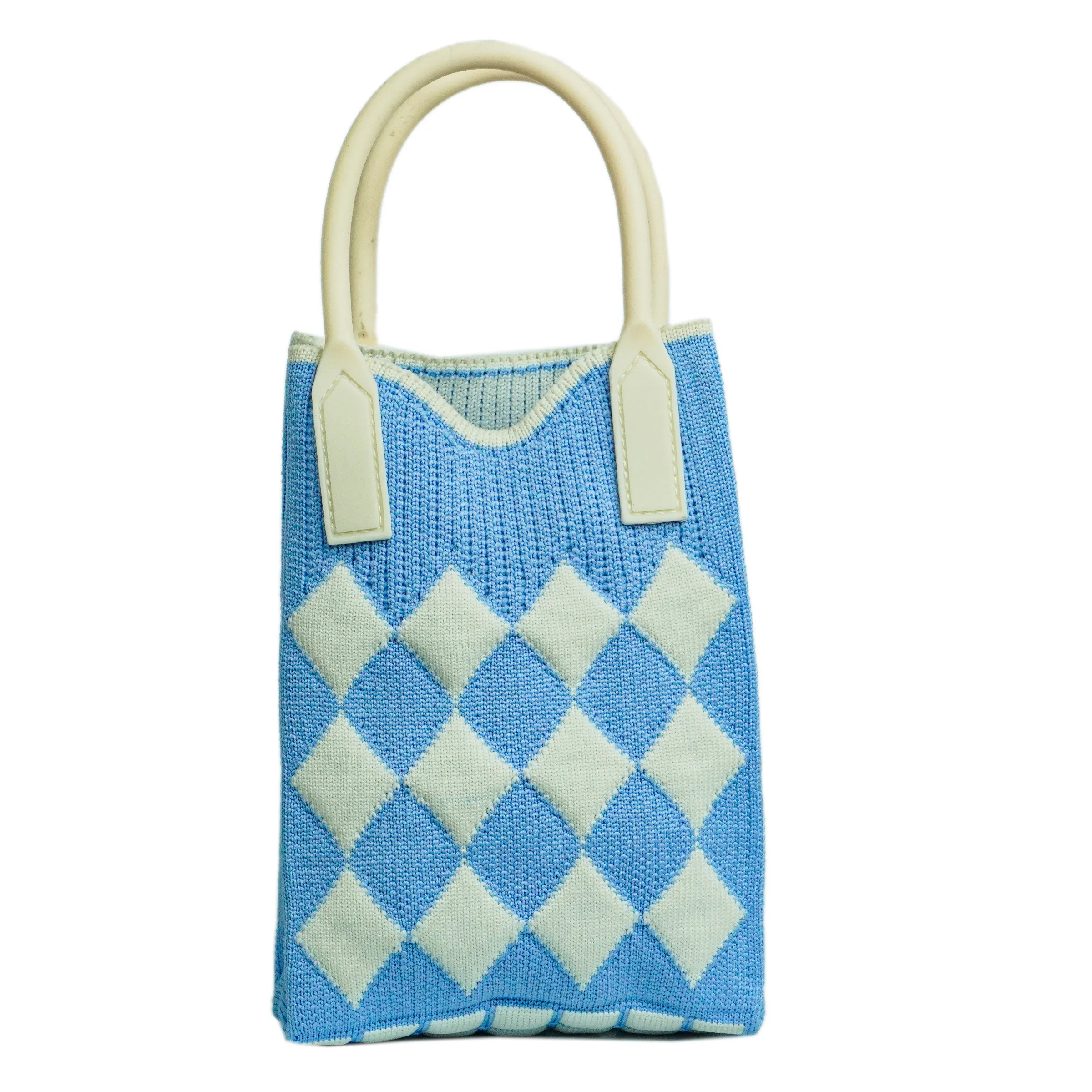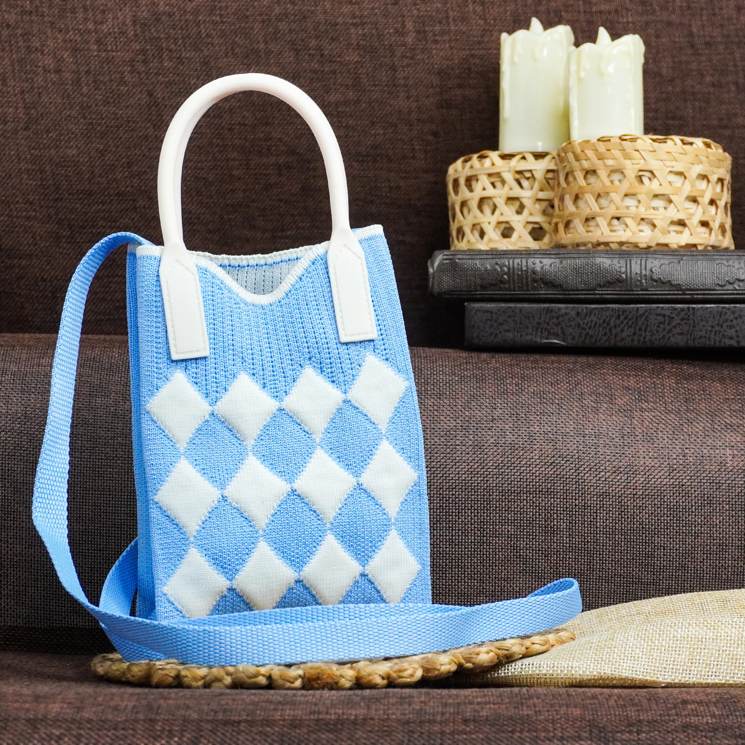 This elegant knitted handbag features a charming blue and white argyle pattern, giving it a trendy yet classic appeal. The bag has a structured design with white handles and a matching adjustable blue strap for versatile carrying options.