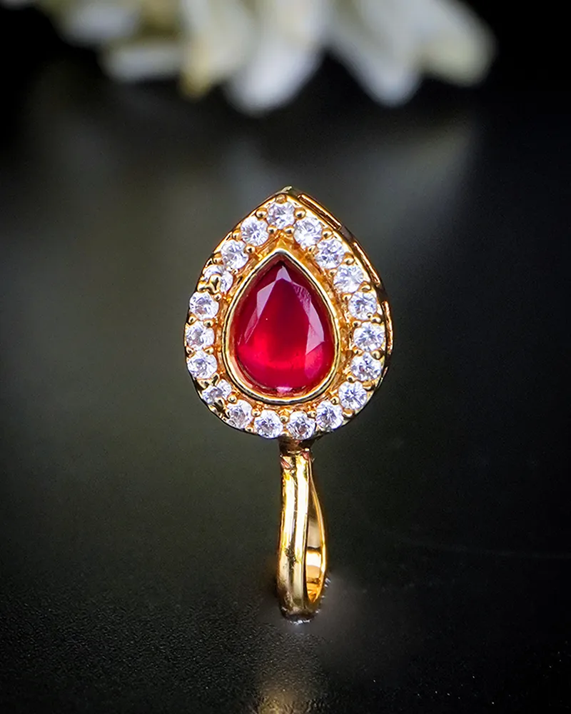 Dramatic and delicate, this Nath features a vivid ruby-toned teardrop centerpiece encased in a dazzling CZ crystal halo. The pear-shaped design offers a bold yet graceful statement, perfect for festive occasions, bridal wear, or elegant evening attire.