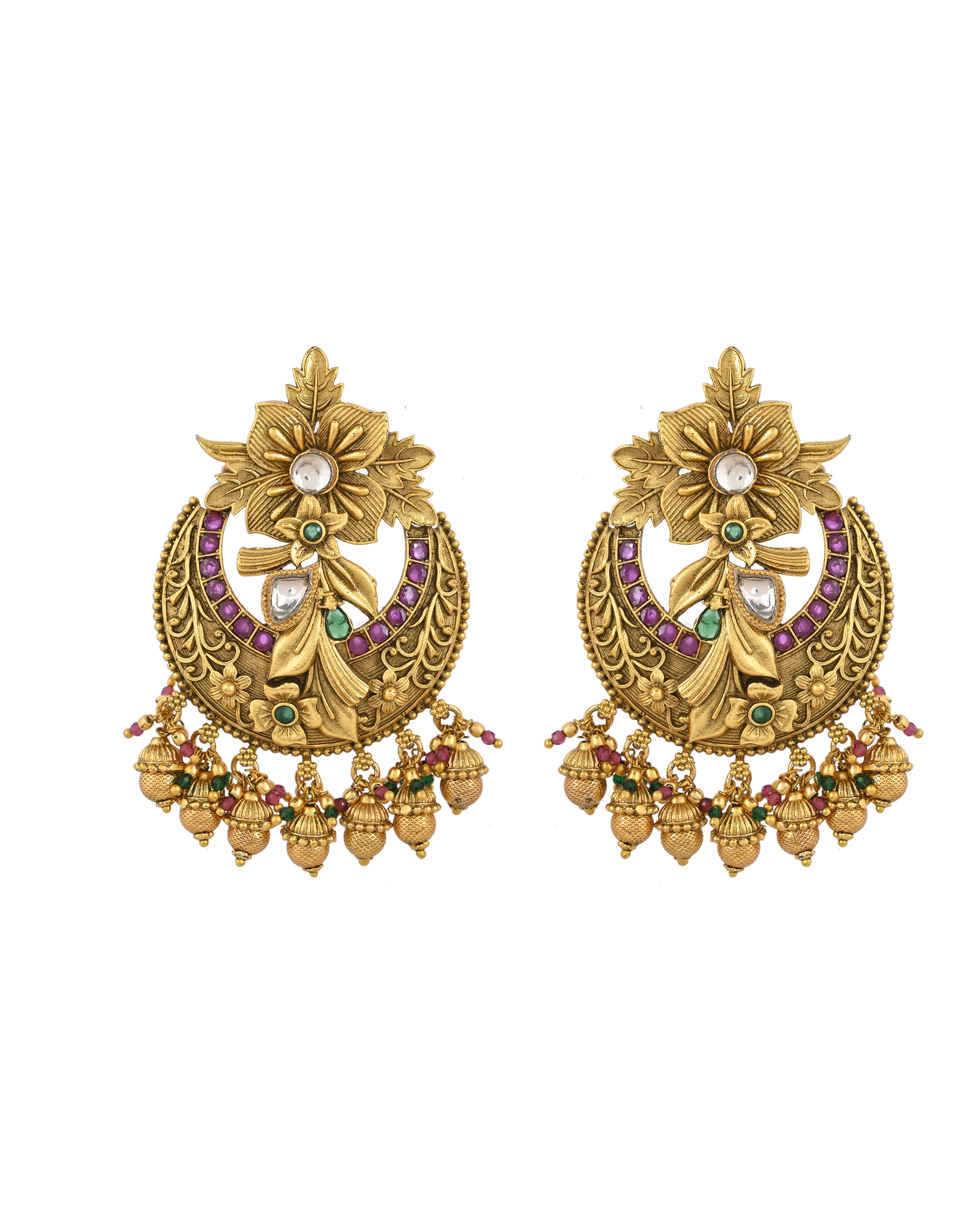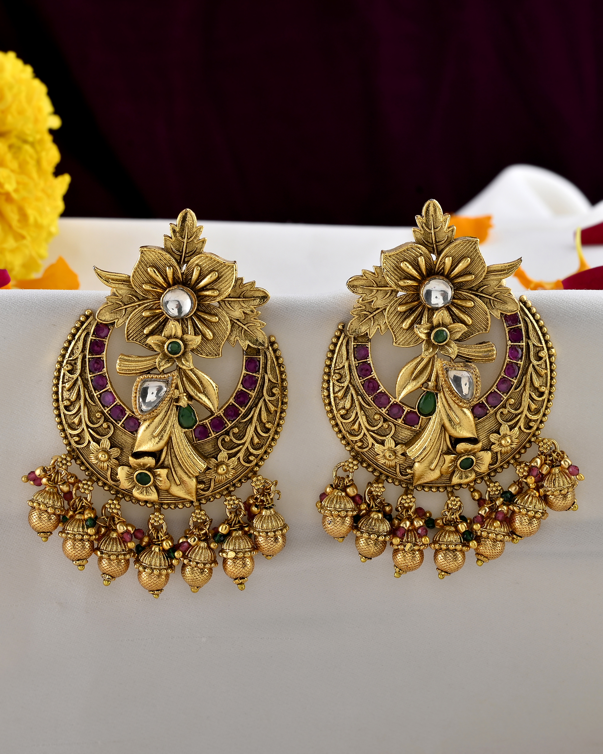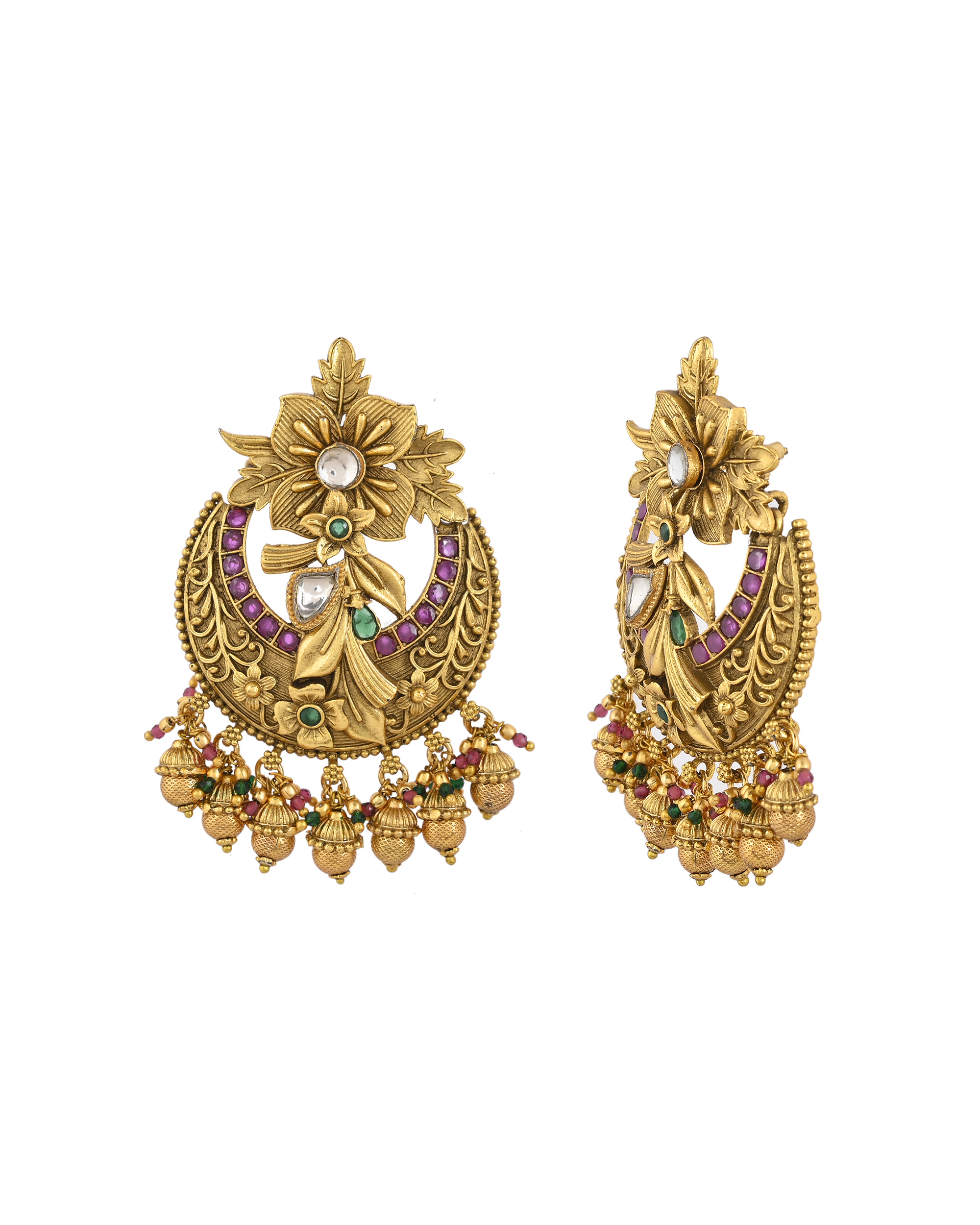 Celebrate the splendor of traditional craftsmanship with these lavish temple-style chandbali earrings. A bold floral motif crowns the design, while rich ruby-hued and emerald accents add a regal pop of color. Finished with rows of gold bead tassels, each earring exudes a grand, heritage charm. Perfect for weddings, festive occasions, or cultural events, these statement pieces showcase timeless Indian artistry at its finest.