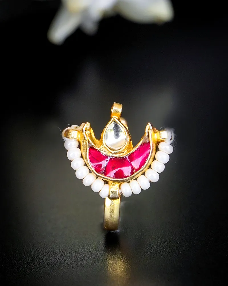 This exquisite traditional nose ring (Nath) showcases the timeless beauty of Indian craftsmanship. Featuring a central Kundan stone in a teardrop shape, it is flanked by vibrant red enamel work shaped like a crescent. The piece is delicately bordered with small white pearl beads, enhancing its elegance and charm. The Nath is set in a rich gold-toned metal, making it perfect for weddings, festive occasions, and cultural events.
