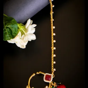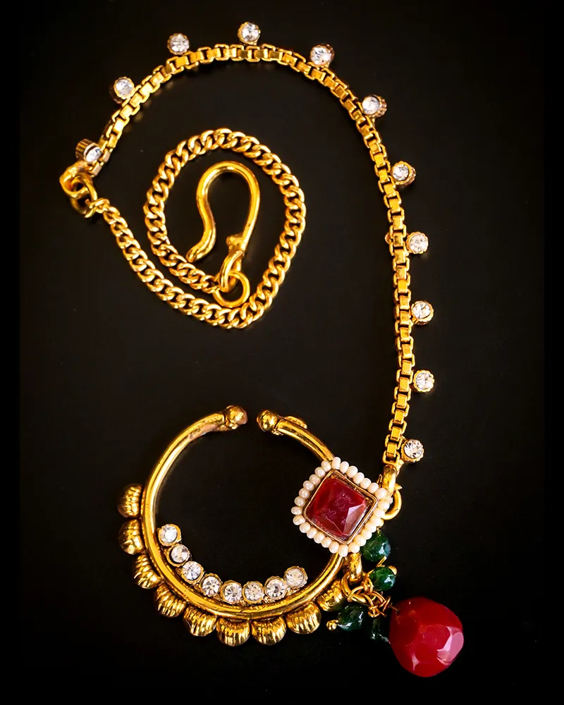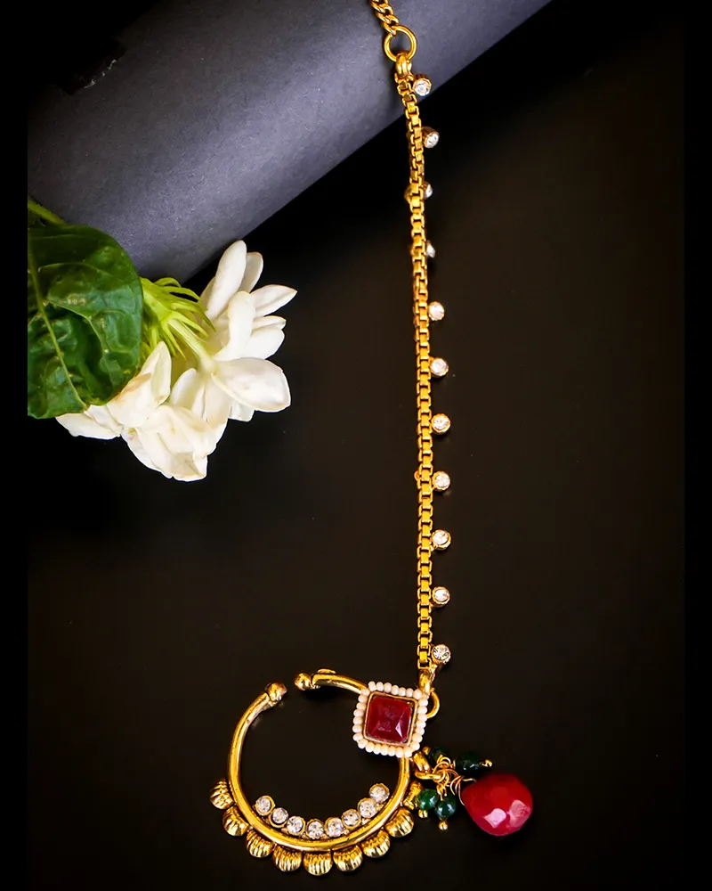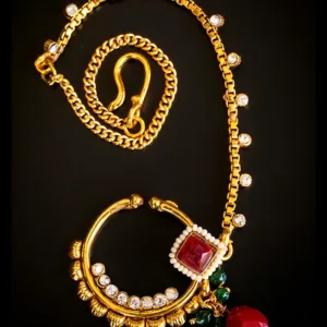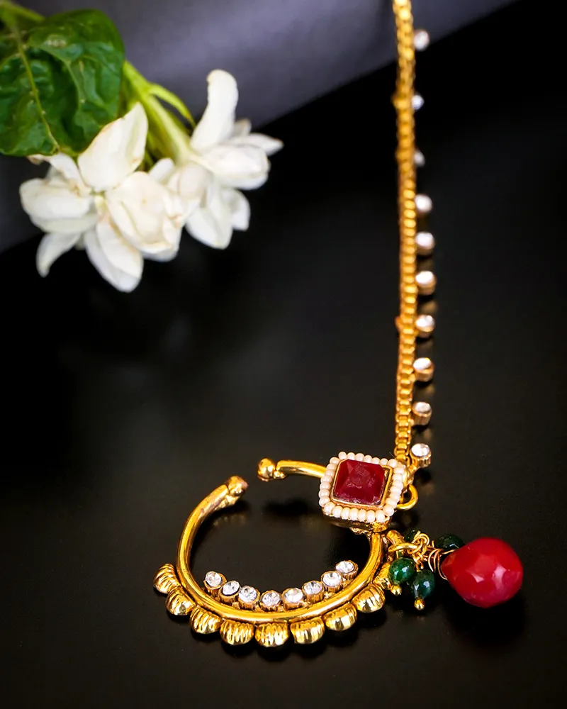 This elegant nath features a striking square ruby-red stone surrounded by delicate pearls, paired with a gold crescent adorned with crystal accents and embossed detailing. Dangling ruby and green beads add a vibrant touch, making it a perfect blend of tradition and color for bridal or festive looks.