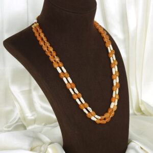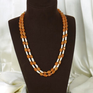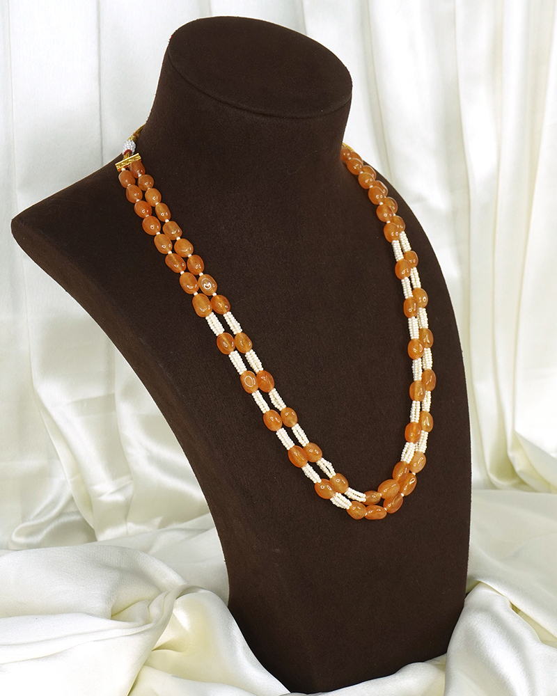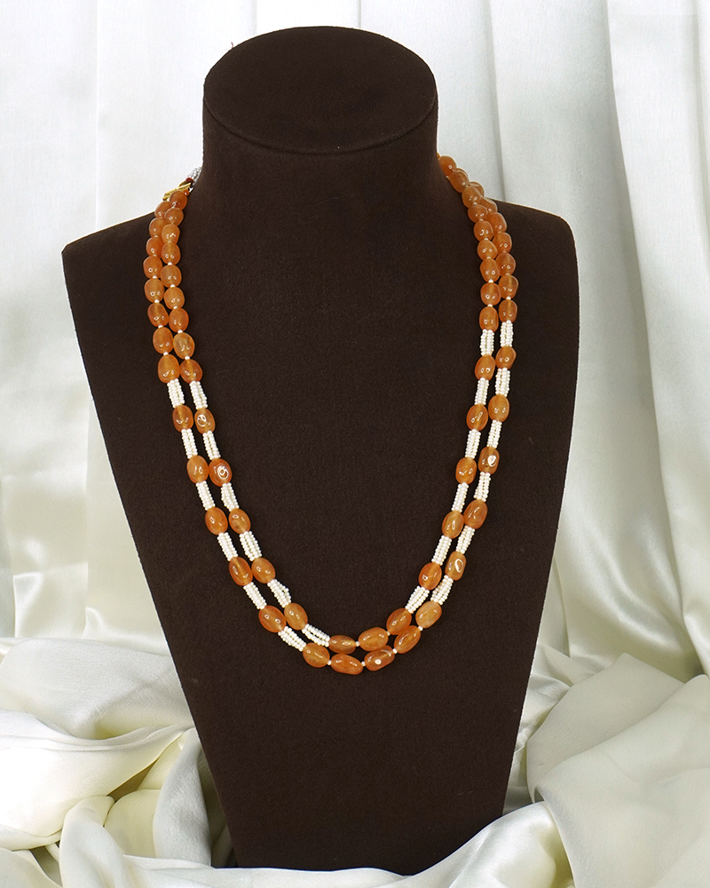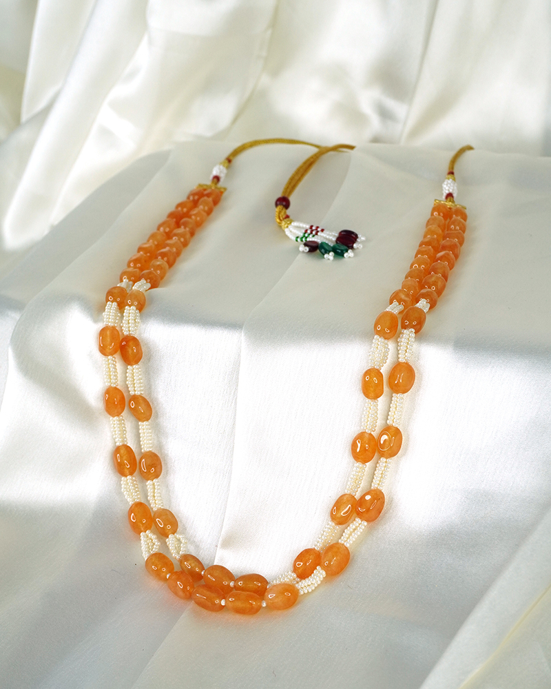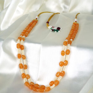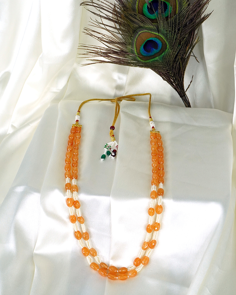 This vibrant necklace features a cheerful and elegant combination of glossy orange oval beads and finely woven white seed beads. The strands are arranged to create a layered effect, giving the necklace a rich and full appearance. Finished with a golden silk thread and multicolored bead tassels, it offers both comfort and traditional appeal. This piece makes a perfect accessory for festive attire, cultural celebrations, or standout daytime looks.