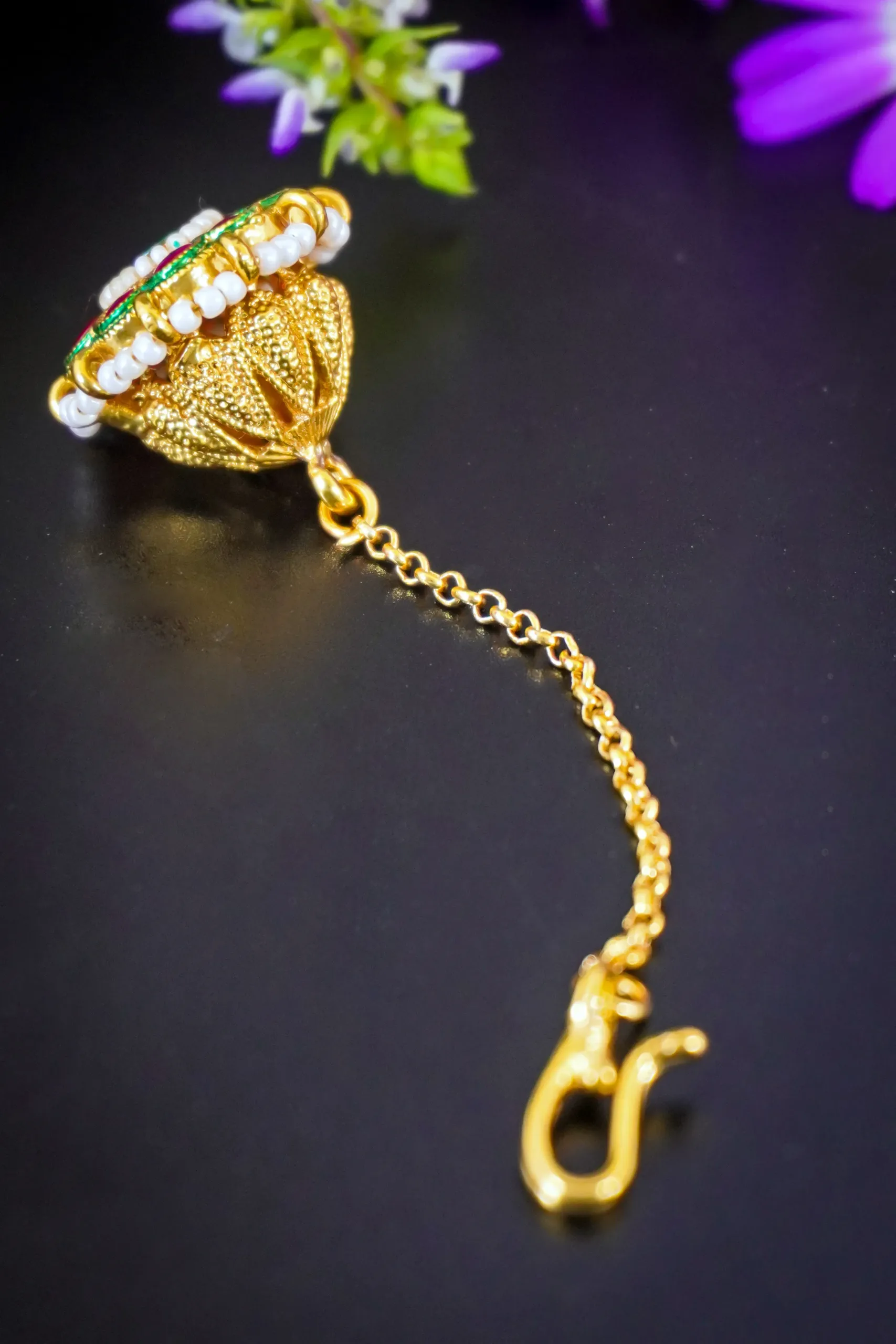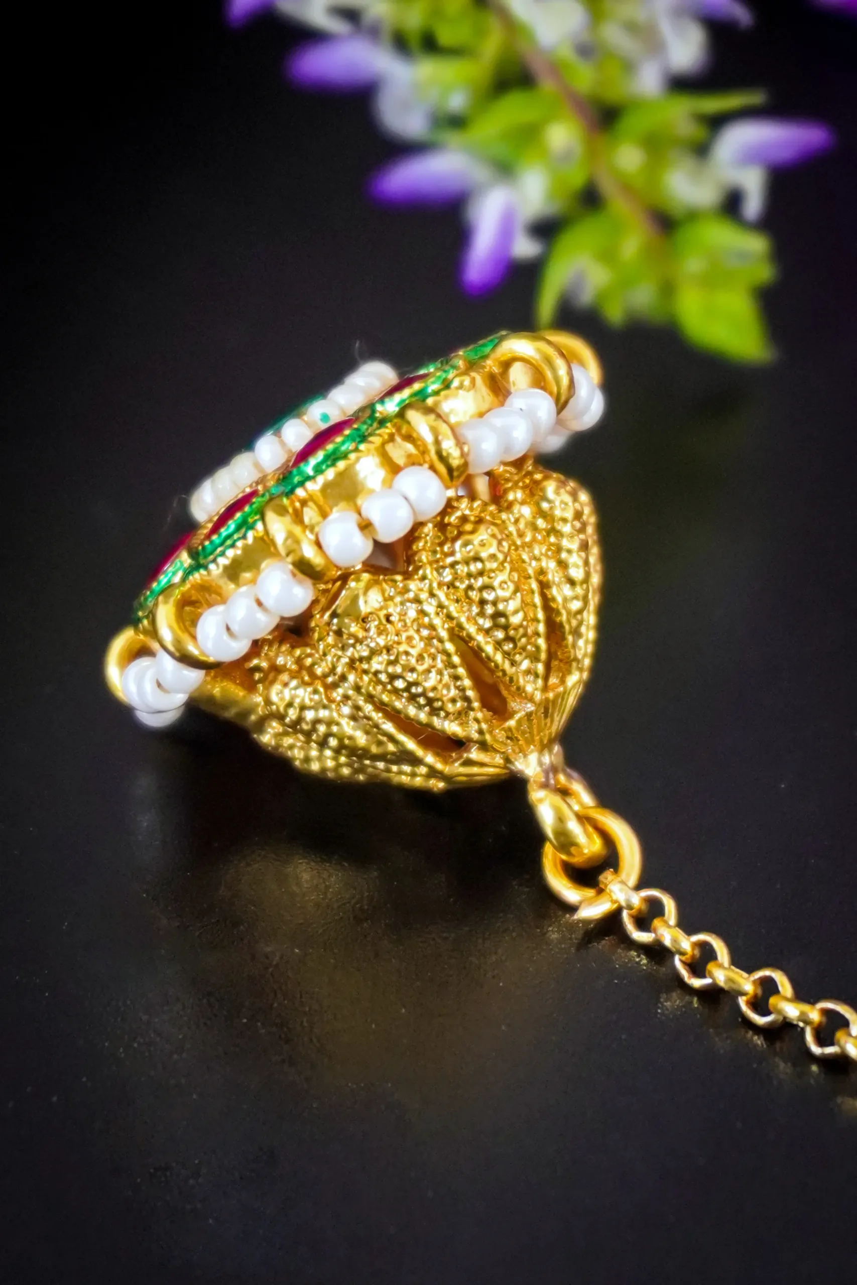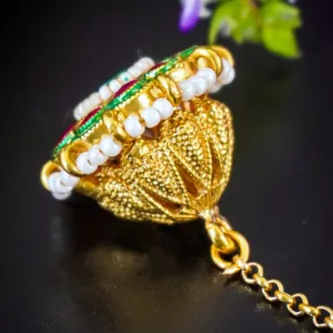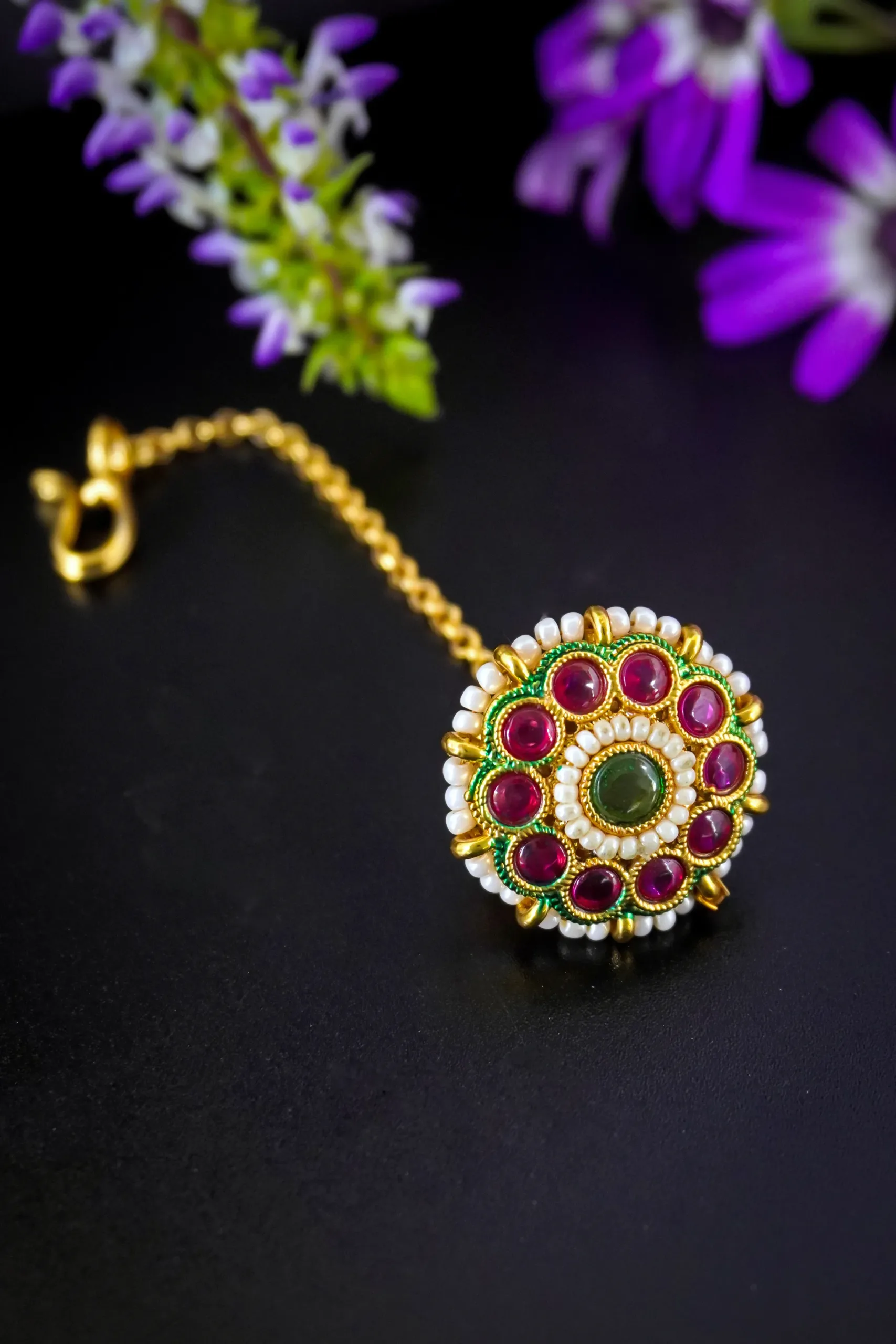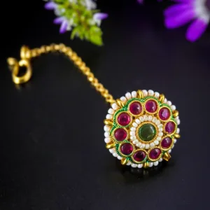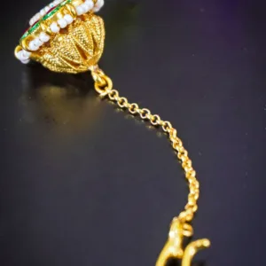 Radiating regal charm, this traditional rakhdi features a bold circular design with a central green kundan stone surrounded by intricate layers of pearls and deep red stones. The golden frame with green enamel highlights and fine pearl edging enhances its rich ethnic appeal. Ideal for weddings, festive occasions, and traditional ensembles, this piece adds a touch of heritage elegance to your look.