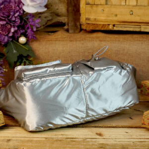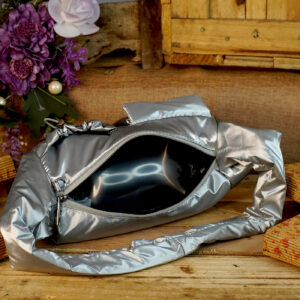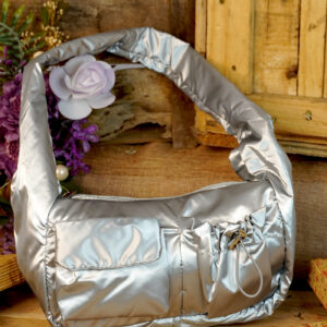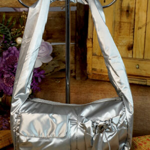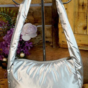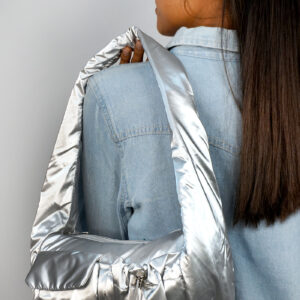 A modern, metallic silver puffer bag with a spacious design, front pockets, and an adjustable strap for everyday style.
