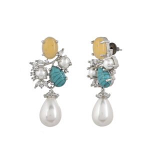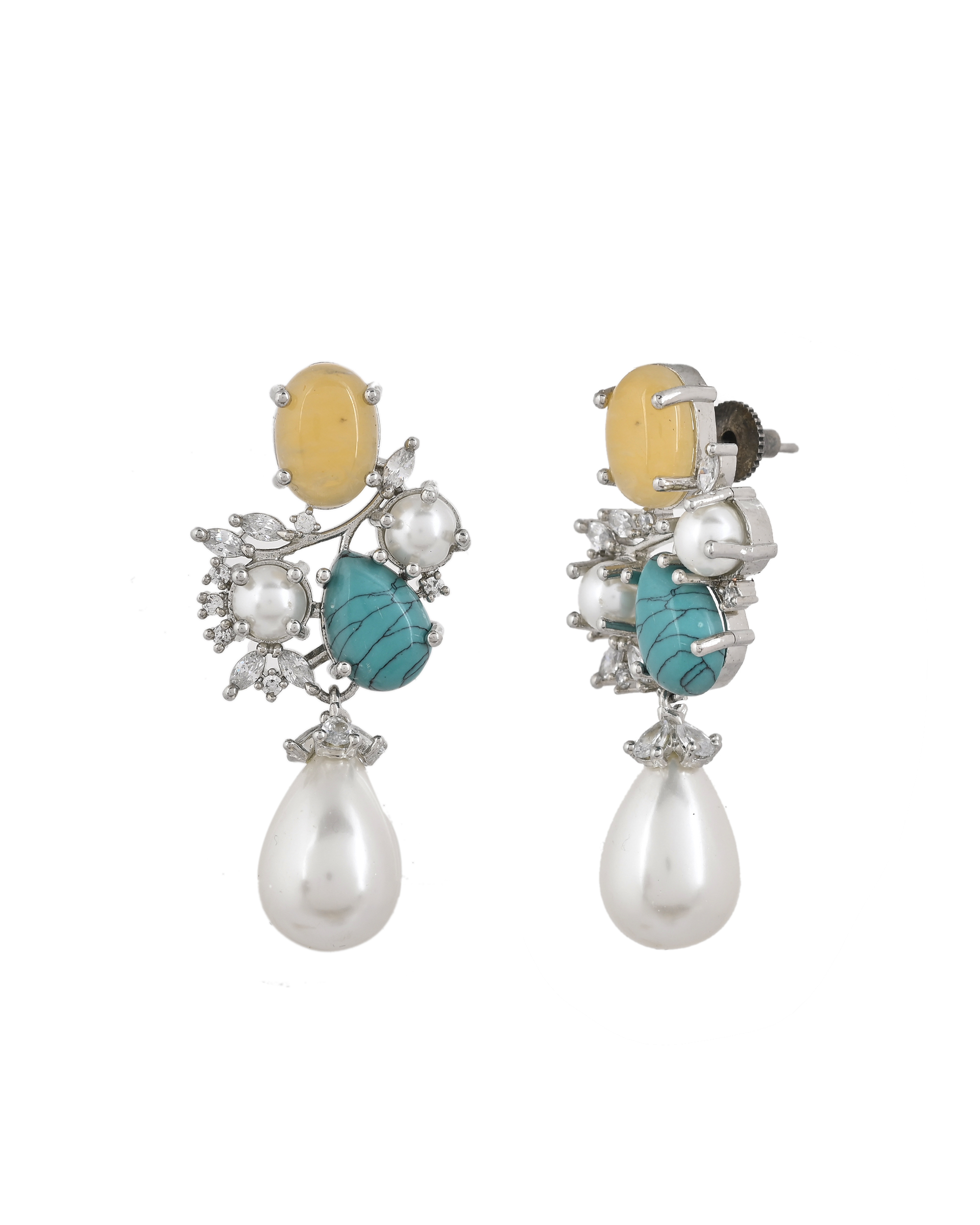 Make a bold statement with these exquisite drop earrings, featuring a luminous yellow-hued stone at the top, surrounded by sparkling crystals and delicate pearl clusters. Vibrant turquoise accents lend a pop of color, while a lustrous pearl drop completes the design with timeless elegance. Perfect for weddings, black-tie events, or any glamorous occasion, these earrings effortlessly blend bohemian charm with refined sophistication.