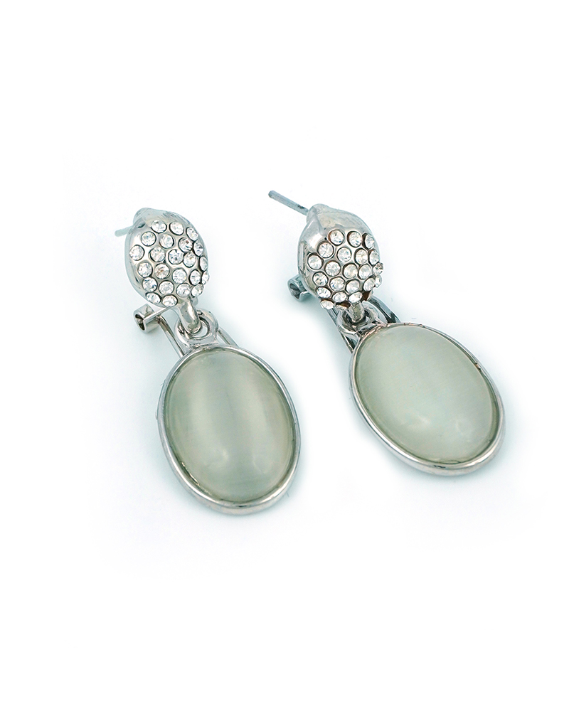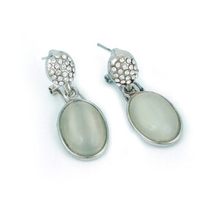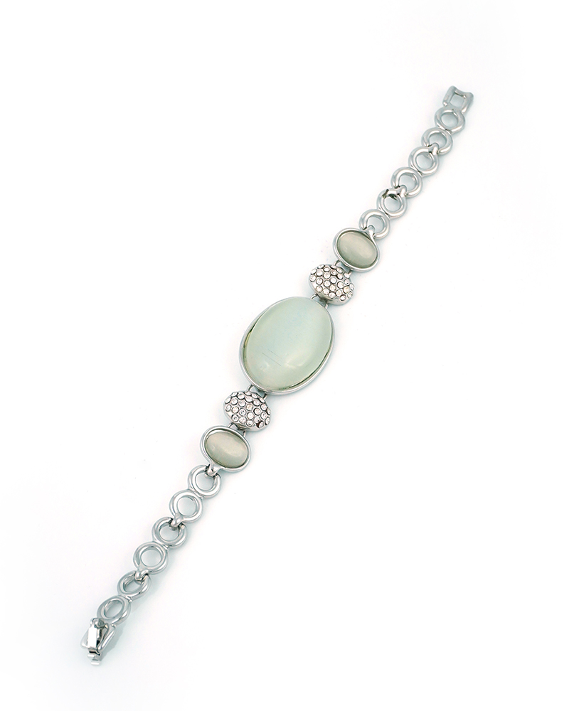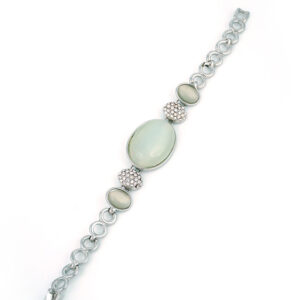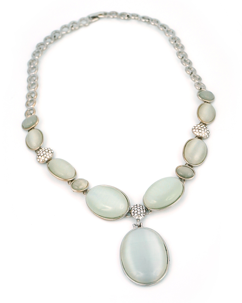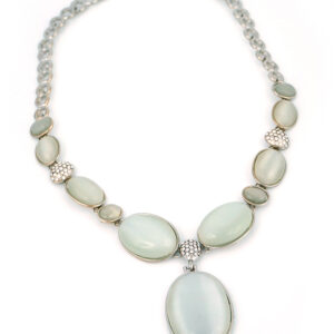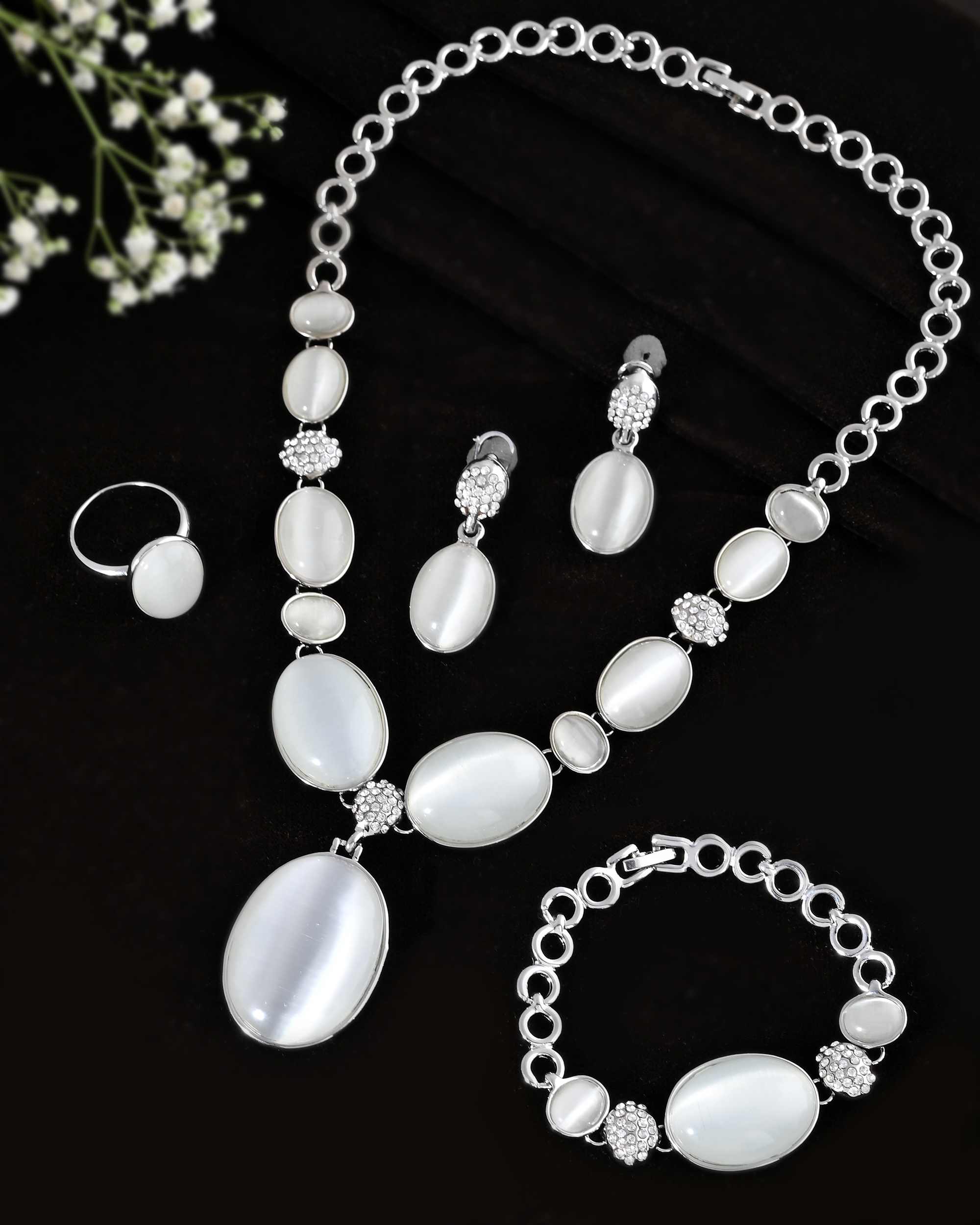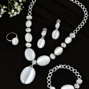 Gracefully designed with elegance in mind, this silver-plated jewelry set features luminous white oval stones framed in polished settings. The necklace boasts a striking central pendant, complemented by a coordinating bracelet, earrings, and ring. Sparkling crystal-studded spacers add a touch of brilliance, making this set ideal for formal occasions, bridal wear, or upscale evening events.